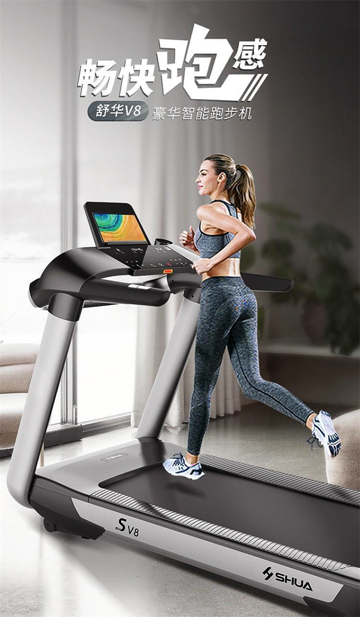 舒华商用跑步机SH-T860(V6)采用商用大跑台,手握心律测试,全跑台减震护足的设计,对您跑步中的膝盖进行全方位的呵护,选用手握式感应片测心率等数据,跑步面积达580×1570mm,可承受180kg的使用者使用。