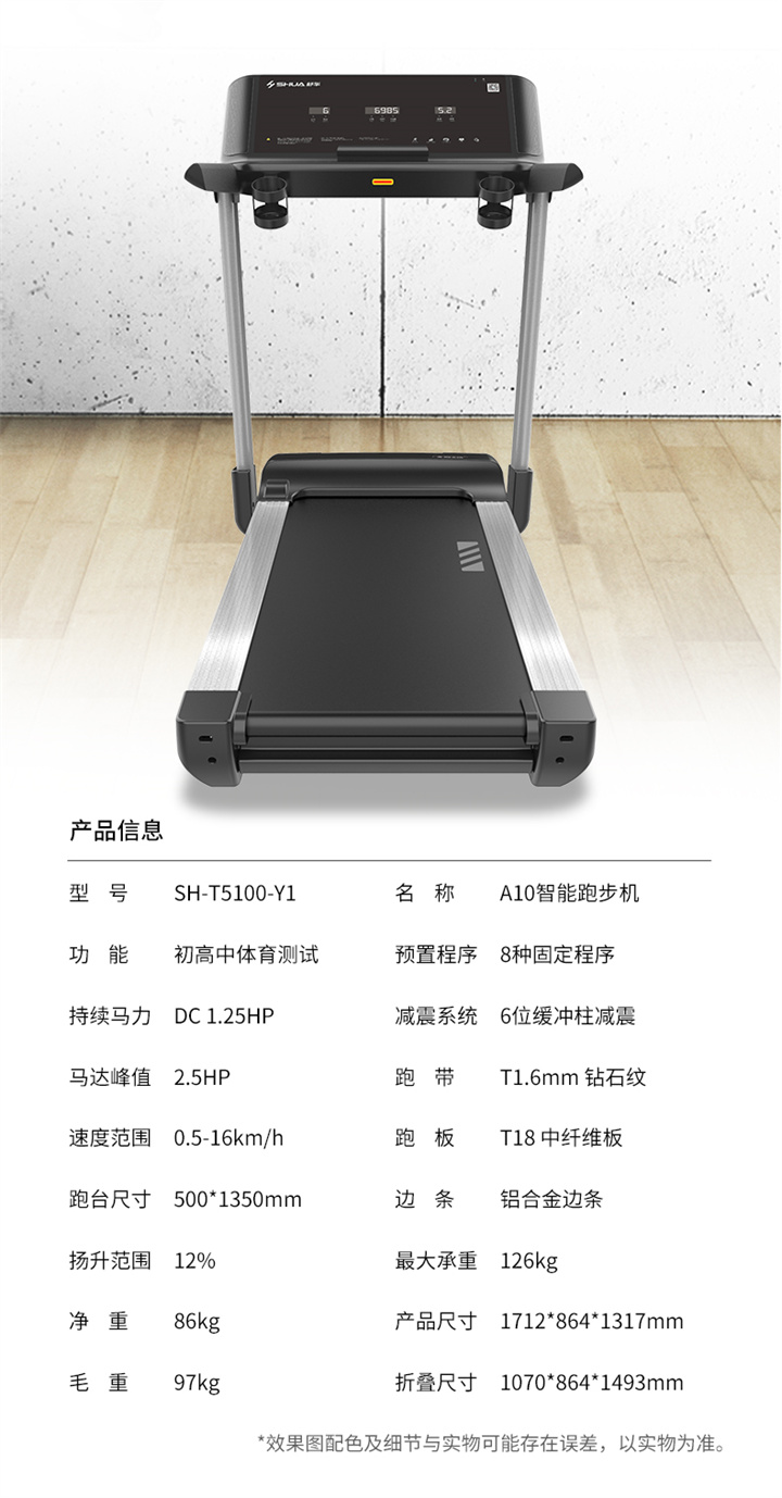 • 产品简介:舒华家用跑步机SH-T5100持续马力达1.25HP,具有500×1350mm的跑台,运用无线心率接收模块监测心率,运用6位硅胶减震设计,最大承重是126kg,可以满足大多数家庭的使用。